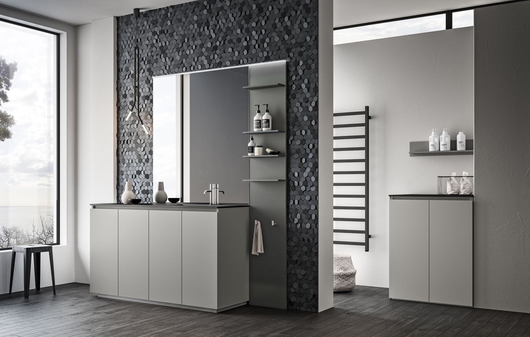 Das Badezimmerlicht sollte nach Möglichkeit freundlich sein. Denn wenn einen das eigene Spiegelbild nicht nur unausgeschlafen, sondern auch bis ins letzte Detail ausgeleuchtet am Morgen begrüßt, dreht man am liebsten gleich wieder um. Für einen guten Start in den Tag ist daher eine ausgewogene und stimmungsvolle Beleuchtung vorteilhaft. Sie sorgt außerdem für ein freundliches Wohlfühlambiente und ideale Lichtverhältnisse. Eine extra Wandlampe oder eine dimmbare Spiegelleuchte machen da bereits einen großen Unterschied.